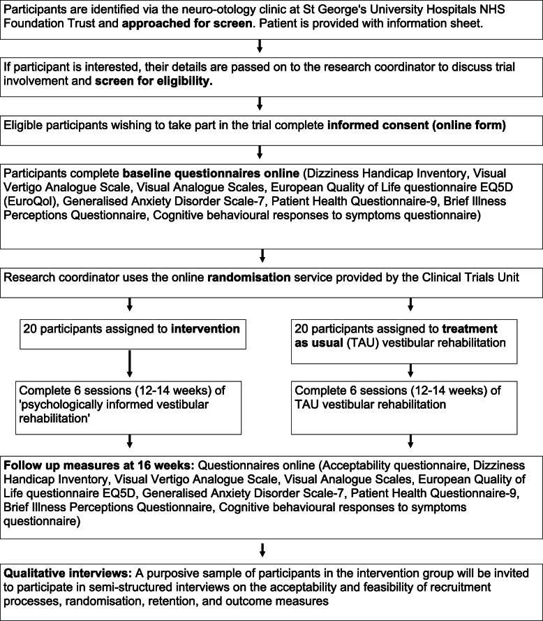Methods: Forty adult patients will be recruited from a tertiary vestibular clinic with persistent movement-triggered dizziness for 3 months or longer who have moderate-high levels of dizziness handicap. Participants will be 1:1 randomised, using a minimisation procedure, to six sessions of either CBT-VR (intervention arm) or VR only (control arm). Measures will be collected at baseline and 4 months post randomisation. The primary feasibility outcomes include descriptive data on numbers meeting eligibility criteria, rates of recruitment, numbers retained post randomisation, treatment adherence and an acceptability questionnaire. Treatment effects on self-report outcomes will be estimated to determine that 95% confidence intervals for the effects are consistent with anticipated effects and minimum clinically important differences, and to provide information needed for the power calculation of an efficacy trial. A nested qualitative study will be conducted post-intervention (intervention group only) to explore the acceptability of the intervention and identify any areas in need of improvement.