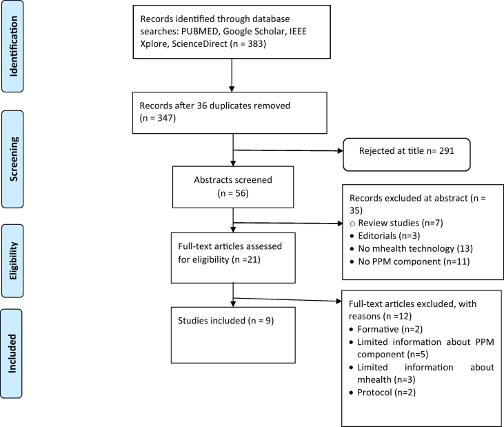 Methods: Google scholar, PUBMED, IEEE Xplore and ScienceDirect databases were searched for peer reviewed literature from 1st January 2003 to 31st December 2020 for studies about the mHealth interventions for public private mix in TB care. This was guided by the scoping review methodology proposed by Arksey and O' Malley. In order to assess the quality of the selected studies, mHealth evidence reporting and assessment (mERA) checklist was utilized. Studies that discussed the utilization of mHealth interventions for implementing PPM in TB care were included. Nine studies met the inclusion criteria and were analyzed for review.