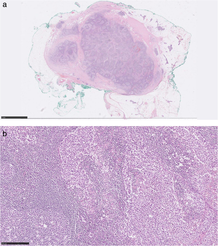 Conclusions: Only 11 cases have previously been reported of primary mediastinal seminoma with florid follicular lymphoid hyperplasia. Although rare, a primary mediastinal seminoma should be considered as a differential diagnosis for presentations with a thymic mass. Tumour markers can be helpful, however are only positive in third of cases. Ultrasound imaging of the gonads is essential to exclude a primary gonadal lesion. Pure seminomas are radiotherapy and chemotherapy sensitive however the mainstay treatment of primary mediastinal seminomas remains surgical excision. Radiotherapy is reserved postoperatively for incomplete surgical margins.