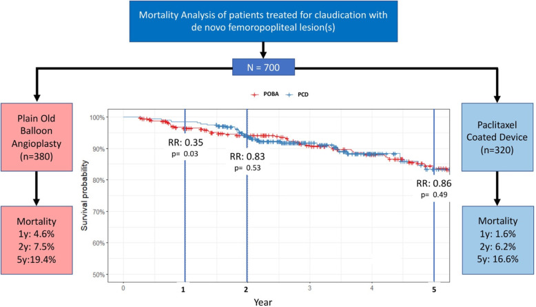 Results: After review of 5219 arteriograms in patients presenting with peripheral artery disease, 700 consecutive patients were included consisting in 72.6% of male (n = 508). Mean age was 68.1 ± 8.5 years. 45.7% of the patients (n = 320) had a treatment including a PCD. Mean femoropopliteal lesion length was 123 ± 91 mm including 44.6% of occlusions. Patients of the control group were censored at crossover to paclitaxel when applicable. Mortality rates at 1, 2 and 5 years were 4.6%, 7.5%, 19.4% and 1.6%, 6.2%, 16.6% in the non-PCD and PCD groups respectively. The relative risks of death when using PCD were 0.35 (p = 0.03), 0.83 (p = NS) and 0.86 (p = NS) at 1, 2 and 5 years respectively.