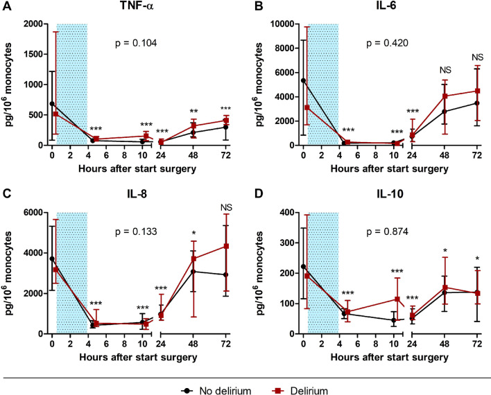 Conclusions: The post-operative attenuation of ex vivo-stimulated production of pro- and anti-inflammatory cytokines was comparable between patients that developed delirium and those who remained delirium-free after on-pump cardiothoracic surgery. This finding suggests that immunoparalysis is not more common in cardiothoracic surgery patients with delirium compared to those without.