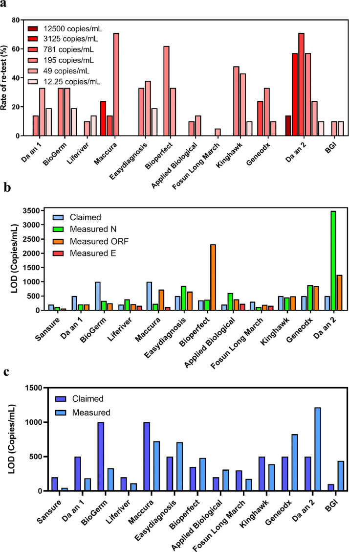 Results: The percentage retesting required with rRT-PCR kits was as follows: 0%, 7.69%, 15.38%, and 23.08% for samples with concentrations ranging from 50 000 to 781 copies/ml. In total, 93% of rRT-PCR kits had a LOD <1000 copies/ml. Only one kit had an LOD >1000 copies/ml. The LOD of other molecular detection kits ranged from 68 to 2264 copies/ml.