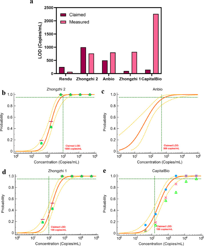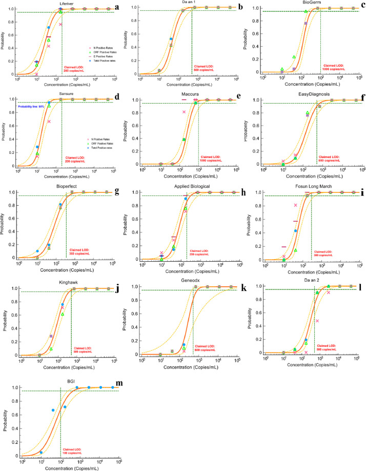Objectives: Severe acute respiratory syndrome coronavirus 2 (SARS-CoV-2) infection has had a significant impact on global public health systems, making nucleic acid detection an important tool in epidemic prevention and control. Detection kits based on real-time reverse transcriptase PCR (rRT-PCR) have been used widely in clinics, but their analytical sensitivity (limit of detection, LOD) remains controversial. Moreover, there is limited research evaluating the analytical sensitivity of other molecular detection kits.