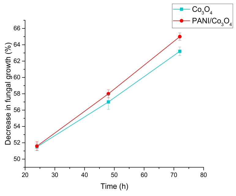 Plant-mediated synthesis of nanoparticles exhibits great potential to minimize the generation of chemical waste through the utilization of non-toxic precursors. In this research work, we report the synthesis of magnesium oxide (MgO) and cobalt oxide (Co3O4) nanoparticles through a green approach using Manilkara zapota leaves extract, their surface modification by polyaniline (PANI), and antifungal properties against Aspergillus niger. Textural and structural characterization of modified and unmodified metal oxide nanoparticles were evaluated using FT-IR, SEM, and XRD. The optimal conditions for inhibition of Aspergillus niger were achieved by varying nanoparticles' concentration and time exposure. Results demonstrate that PANI/MgO nanoparticles were superior in function relative to PANI/Co3O4 nanoparticles to control the growth rate of Aspergillus niger at optimal conditions (time exposure of 72 h and nanoparticles concentration of 24 mM). A percentage decrease of 73.2% and 65.1% in fungal growth was observed using PANI/MgO and PANI/Co3O4 nanoparticles, respectively, which was higher than the unmodified metal oxide nanoparticles (67.5% and 63.2%).