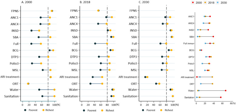 Results: In the national-level health service indicators, inequality indices decreased substantially from 2000 to 2030. However, the wide inequalities are projected to remain in DTP3, measles, full immunisations, and antenatal care in 2030. The pro-rich inequality gap in catastrophic health expenditure increased significantly in all governorates except Sulaimaniya from 2007 to 2012. The higher increases in pro-rich inequality were found in Missan, Karbala, Erbil, and Diala. Mothers' higher education and more antenatal care visits were possible factors for increased coverage of health service indicators. The higher number of children and elderly population in the households were potential risk factors for an increased risk of catastrophic and impoverishing health payment in Iraq.