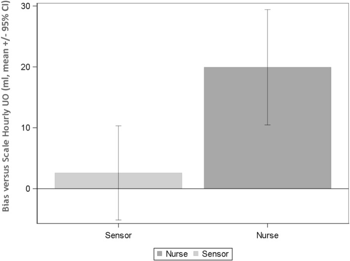 Acute kidney injury (AKI) is defined by changes in serum creatinine and urine output (UO). Significant limitations exist regarding accurate ascertainment of urine output even within the intensive care unit. We sought to evaluate an automated urine output collections system and compare it to nursing measurements. We prospectively collected urine output using an electronic urine monitoring system and compared it to charted hourly UO in 44 patients after cardiac surgery at a single university hospital ICU. We calculated UO and oliguria rates and compared them to data from the sensor and from nursing charting. A total of 187 hourly UO measurements were obtained and on average, UO was reported 47 min late, with a median of 18 min, and a maximum of almost 6 h. Patients had a mean hourly UO of 76.3 ml over the observation period. Compared to manual measurements by study personnel, nurses significantly overestimated hourly UO by 19.9 ml (95% CI: 10.3; 29.5; p = < 0.001). By contrast, the mean difference between the UO measured with the sensor and by study personnel was 2.29 ml (95% CI: - 6.7; 11.3), p = 0.61. Electronic UO monitoring is significantly more accurate than nurse-performed manual measurements in actual intensive care patients. Furthermore, timely ascertainment of UO is difficult to achieve with manual technique, resulting in important delays in detecting oliguria perhaps leading to missed cases of AKI.