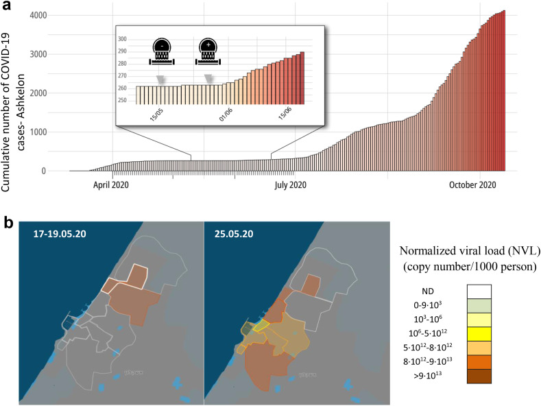 The COVID-19 pandemic created a global crisis impacting not only healthcare systems, but also economics and society. Therefore, it is important to find novel methods for monitoring disease activity. Recent data have indicated that fecal shedding of SARS-CoV-2 is common, and that viral RNA can be detected in wastewater. This suggests that wastewater monitoring is a potentially efficient tool for both epidemiological surveillance, and early warning for SARS-CoV-2 circulation at the population level. In this study we sampled an urban wastewater infrastructure in the city of Ashkelon (̴ 150,000 population), Israel, during the end of the first COVID-19 wave in May 2020 when the number of infections seemed to be waning. We were able to show varying presence of SARS-CoV-2 RNA in wastewater from several locations in the city during two sampling periods, before the resurgence was clinically apparent. This was expressed with a new index, Normalized Viral Load (NVL) which can be used in different area scales to define levels of virus activity such as red (high) or green (no), and to follow morbidity in the population at the tested area. The rise in viral load between the two sampling periods (one week apart) indicated an increase in morbidity that was evident two weeks to a month later in the population. Thus, this methodology may provide an early indication for SARS-CoV-2 infection outbreak in a population before an outbreak is clinically apparent.