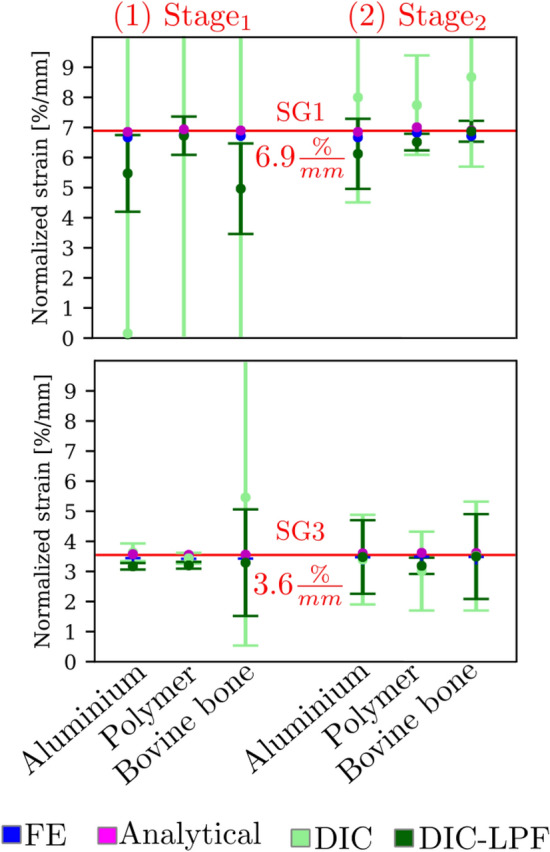 Strains on the surface of engineering structures or biological tissues are non-homogeneous. These strain fields can be captured by means of Digital Image Correlation (DIC). However, DIC strain field measurements are prone to noise and filtering of these fields influences measured strain gradients. This study aims to design a novel tensile test specimen showing two linear gradients, to measure full-field linear strain measurements on the surface of test specimens, and to investigate the accuracy of DIC strain measurements globally (full-field) and locally (strain gauges' positions), with and without filtering of the DIC strain fields. Three materials were employed for this study: aluminium, polymer, and bovine bone. Normalized strain gradients were introduced that are load independent and evaluated at two local positions showing 3.6 and 6.9% strain change per mm. Such levels are typically found in human bones. At these two positions, two strain gauges were applied to check the experimental strain magnitudes. A third strain gauge was applied to measure the strain in a neutral position showing no gradient. The accuracy of the DIC field measurement was evaluated at two deformation stages (at [Formula: see text] 500 and 1750 μstrain) using the root mean square error (RMSE). The RMSE over the two linear strain fields was less than 500 μstrain for both deformation stages and all materials. Gaussian low-pass filter (LPF) reduced the DIC noise between 25% and 64% on average. As well, filtering improved the accuracy of the local normalized strain gradients measurements with relative difference less than 20% and 12% for the high- and low-gradient, respectively. In summary, a novel specimen shape and methodological approach are presented which are useful for evaluating and improving the accuracy of the DIC measurement where non-homogeneous strain fields are expected such as on bone tissue due to their hierarchical structure.