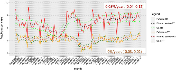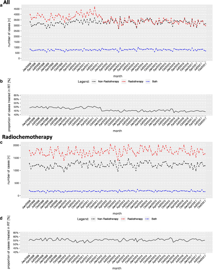 Results: Overall, the number of patients treated with radiotherapy as inpatients remained constant between 2008 (N = 90,952) and 2017 (N = 88,998). Starting in January 2008, 48.9% of 4000 monthly cases received their treatment solely in a radiation oncology department. This figure decreased to 43.7% of 2971 monthly cases in October 2017. We found a stepwise decrease between December 2011 and January 2012 amounting to 4.3%. Fractions received in radiotherapy departments decreased slightly by 29.3 (95% CI: 14.0-44.5) fractions per month. The number of days hospitalized in radiotherapy departments decreased by 83.4 (95% CI: 59.7, 107.0) days per month, starting from a total of 64,842 days in January 2008 to 41,254 days in 2017. Days per case decreased from 16.2 in January 2008 to 13.9 days in October 2017.