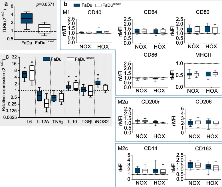 Methods: Conditioned media (CMNOX or CMHOX) from cell lines UT-SCC-8, UT-SCC-74A, FaDu, MDA-MB-231 and HaCat cultured under normoxic (21% O2) and hypoxic (1% O2) conditions were used to polarize human monocyte-derived macrophages. Macrophage polarization was measured by flow cytometry and the production of cytokine mRNA using Taqman qPCR. To study the role of TLR9 in macrophage polarization, the lentiviral CRISPR/Cas9 method was used to establish a stable FaDuTLR9def clone.