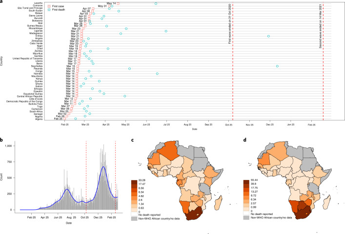 Countries of the World Health Organization (WHO) African Region have experienced a wide range of coronavirus disease 2019 (COVID-19) epidemics. This study aimed to identify predictors of the timing of the first COVID-19 case and the per capita mortality in WHO African Region countries during the first and second pandemic waves and to test for associations with the preparedness of health systems and government pandemic responses. Using a region-wide, country-based observational study, we found that the first case was detected earlier in countries with more urban populations, higher international connectivity and greater COVID-19 test capacity but later in island nations. Predictors of a high first wave per capita mortality rate included a more urban population, higher pre-pandemic international connectivity and a higher prevalence of HIV. Countries rated as better prepared and having more resilient health systems were worst affected by the disease, the imposition of restrictions or both, making any benefit of more stringent countermeasures difficult to detect. Predictors for the second wave were similar to the first. Second wave per capita mortality could be predicted from that of the first wave. The COVID-19 pandemic highlights unanticipated vulnerabilities to infectious disease in Africa that should be taken into account in future pandemic preparedness planning.