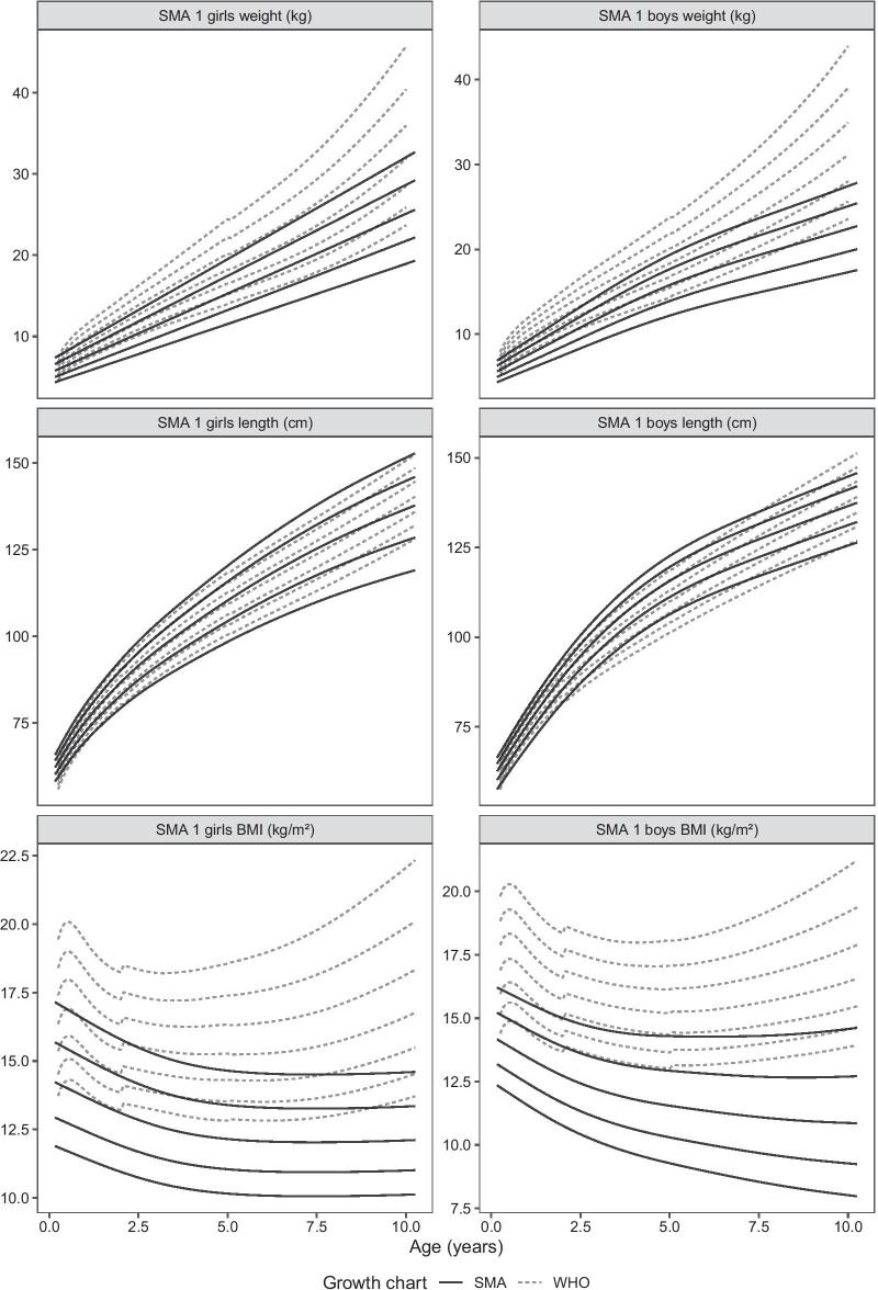 Results: Body Weight (BW, kg) and Supine Length (SL, cm) were collected using a published standardized procedure. SMA-specific growth percentiles curves were developed and compared to the WHO reference data. We recruited 133 SMA1 and 82 SMA2 (48.8% females). Mean ages were 0.6 (0.4-1.6) and 4.1 (2.1-6.7) years, respectively. We present here a set of disease-specific percentiles curves of BW, SL, and BMI-for-age for girls and boys with SMA1 and SMA2. These curves show that BW is significantly lower in SMA than healthy peers, while SL is more variable. BMI is also typically lower in both sexes and at all ages.