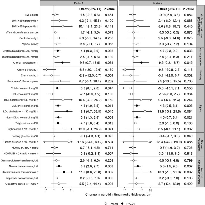 Background Cardiovascular disease depends on the duration and time course of risk factor exposure. Previous reports on risk factors of progression of carotid intima-media thickness (cIMT) in the young were mostly restricted to high-risk populations or susceptible to certain types of bias. We aimed to unravel a risk factor signature for early vessel pathology based on repeated ultrasound assessments of the carotid arteries in the general population. Methods and Results Risk factors were assessed in 956 adolescents sampled from the general population with a mean age of 15.8±0.9 years, 56.2% of whom were female. cIMT was measured at baseline and on average 22.5±3.4 months later by high-resolution ultrasound. Effects of baseline risk factors on cIMT progression were investigated using linear mixed models with multivariable adjustment for potential confounders, which yielded significant associations (given as increase in cIMT for a 1-SD higher baseline level) for alanine transaminase (5.5 μm; 95% CI: 1.5-9.5), systolic blood pressure (4.7 μm; 0.3-9.2), arterial hypertension (9.5 μm, 0.2-18.7), and non-high-density (4.5 μm; 0.7-8.4) and low-density lipoprotein cholesterol (4.3 μm; 0.5-8.1). Conclusions Systolic blood pressure, arterial hypertension, low-density and non-high-density lipoprotein cholesterol, and alanine transaminase predicted cIMT progression in adolescents, even though risk factor levels were predominantly within established reference ranges. These findings reemphasize the necessity to initiate prevention early in life and challenge the current focus of guideline recommendations on high-risk youngsters. Registration URL: https://www.clinicaltrials.gov; Unique identifier: NCT03929692.
