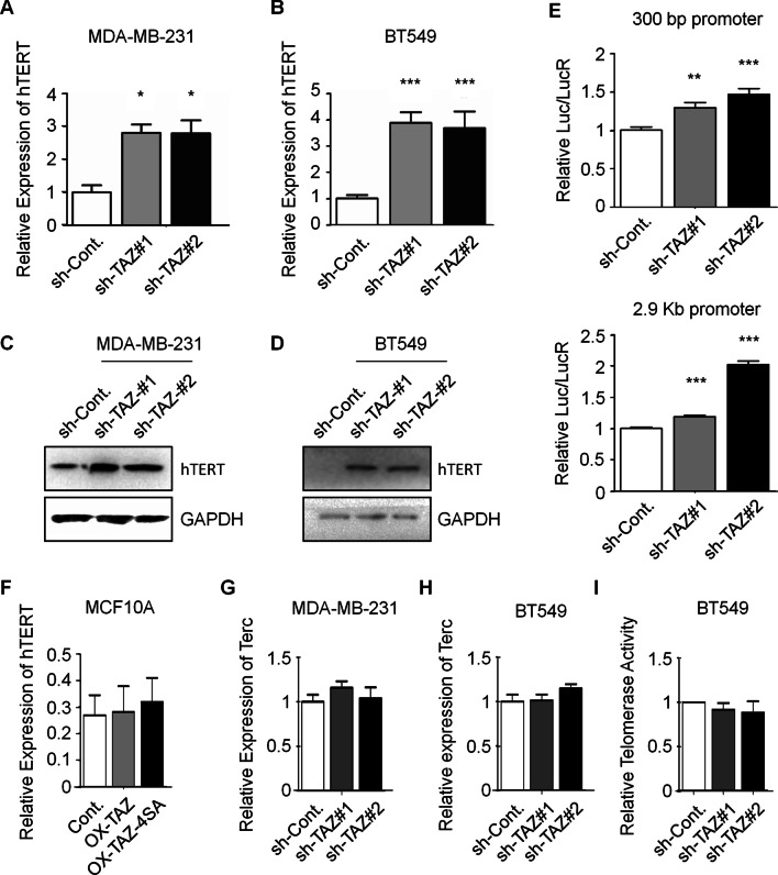 Methods: siRNA and shRNA was used to generate TAZ-depleted TNBC cell lines. qPCR and Southern analysis of terminal restriction fragments techniques were used to test telomere length. Co-immunoprecipitation, Western blotting, immunofluorescence, Luciferase reporter assay and Chromatin-IP were conducted to investigate the underlying mechanism.