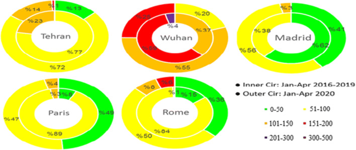 Results: The current study showed the COVID-19 lockdown positively affected Iran's air quality. During the COVID-19 pandemic, the four-month mean air quality index (AQI) values in Tehran, Wuhan, Paris, and Rome were 76, 125, 55, and 60, respectively, which are 8 %, 22 %, 21 %, and 2 % lower than those during the corresponding period (83, 160, 70, and 61) from 2016 to 2019.