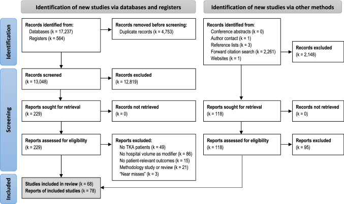 Results: A total of 68 cohort studies with data from 1985 to 2018 were included. The risk of bias for all outcomes ranged from moderate to critical. Higher hospital volume may be associated with a lower rate of early revision ≤ 12 months (narrative synthesis of k = 7 studies, n = 301,378 patients) and is likely associated with lower mortality ≤ 3 months (OR = 0.91 per additional 50 TKAs/year, 95% confidence interval [0.87-0.95], k = 9, n = 2,638,996, I2 = 51%) and readmissions ≤ 3 months (OR = 0.98 [0.97-0.99], k = 3, n = 830,381, I2 = 44%). Hospital volume may not be associated with the rates of deep infections within 1-4 years, late revision (1-10 years) or adverse events ≤ 3 months. The confidence in the cumulative evidence was moderate for mortality and readmission rates; low for early revision rates; and very low for deep infection, late revision and adverse event rates.