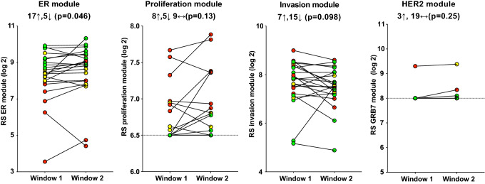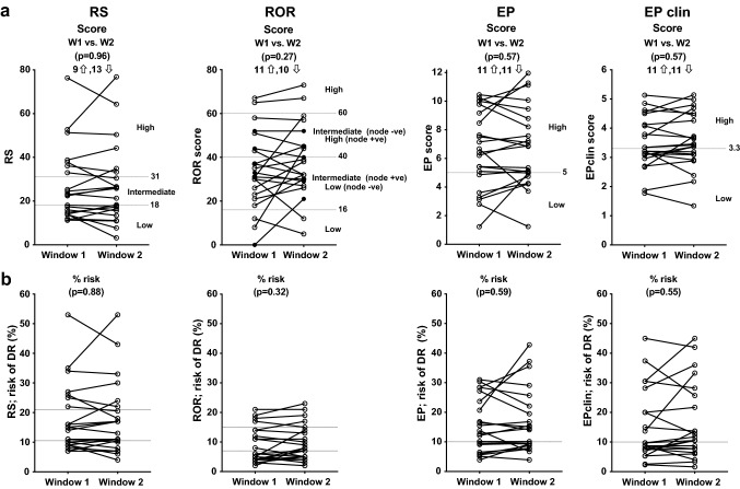 Results: The invasion module score of RS was lower (- 10.9%; p = 0.098), whereas the ER (+ 16.6%; p = 0.046) and proliferation (+ 7.3%; p = 0.13) module scores were higher in W2. PGR expression was significantly increased in W2 (+ 81.4%; p = 0.0029). Despite this, mean scores were not significantly different between W1 and W2 for any of the tests and the two measurements showed high correlation (r = 0.72-0.93). However, variability between the two measurements led to tumours being assigned to different risk categories in the following proportion of cases: RS 22.7%, ROR 27.3%, EP 13.6% and EPclin 13.6%.
