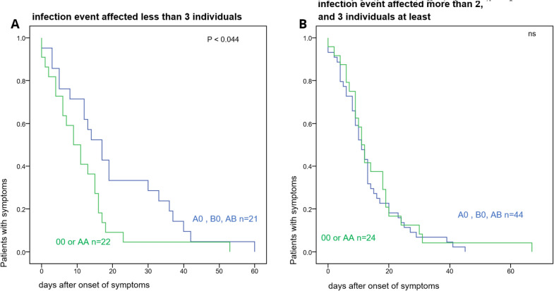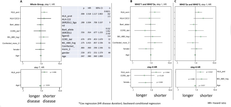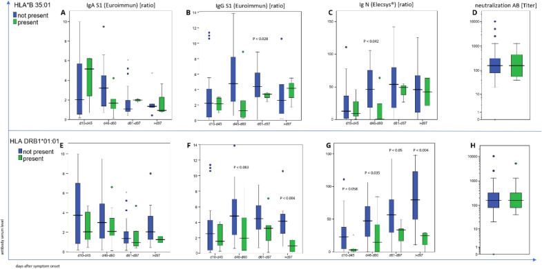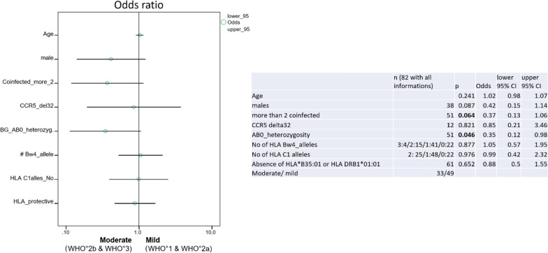 Results: Univariate HLA analyses identified putatively protective HLA alleles (HLA class II DRB1*01:01 and HLA class I B*35:01, with a trend for DRB1*03:01). They were associated with reduced durations of disease instead decreased (rather than increased) total anti-S IgG levels. They had a higher virus neutralizing capacity compared to non-carriers. Conversely, analyses also identified HLA alleles (HLA class II DQB1*03:02 und HLA class I B*15:01) not associated with such benefit in the patient cohort of this study. Hierarchical testing by Cox regression analyses confirmed the significance of the protective effect of the HLA alleles identified (when assessed in composite) in terms of disease duration, whereas AB0 blood group antigen heterozygosity was found to be significantly associated with disease severity (rather than duration) in our cohort. A suggestive association of a heterozygous CCR5 delta 32 mutation status with prolonged disease duration was implied by univariate analyses but could not be confirmed by hierarchical multivariate testing.