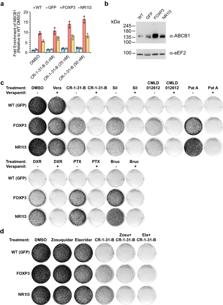 Rocaglates are a class of eukaryotic translation initiation inhibitors that are being explored as chemotherapeutic agents. They function by targeting eukaryotic initiation factor (eIF) 4A, an RNA helicase critical for recruitment of the 40S ribosome (and associated factors) to mRNA templates. Rocaglates perturb eIF4A activity by imparting a gain-of-function activity to eIF4A and mediating clamping to RNA. To appreciate how rocaglates could best be enabled in the clinic, an understanding of resistance mechanisms is important, as this could inform on strategies to bypass such events as well as identify responsive tumor types. Here, we report on the results of a positive selection, ORFeome screen aimed at identifying cDNAs capable of conferring resistance to rocaglates. Two of the most potent modifiers of rocaglate response identified were the transcription factors FOXP3 and NR1I3, both of which have been implicated in ABCB1 regulation-the gene encoding P-glycoprotein (Pgp). Pgp has previously been implicated in conferring resistance to silvestrol, a naturally occurring rocaglate, and we show here that this extends to additional synthetic rocaglate derivatives. In addition, FOXP3 and NR1I3 impart a multi-drug resistant phenotype that is reversed upon inhibition of Pgp, suggesting a potential therapeutic combination strategy.