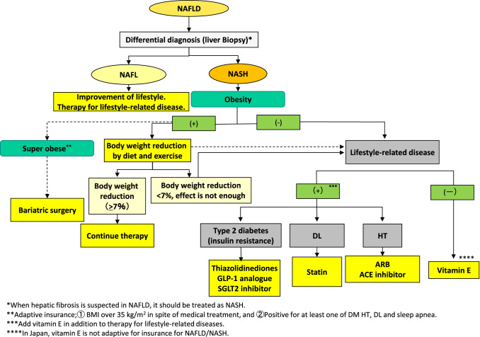 Nonalcoholic fatty liver disease (NAFLD) has become a serious public health issue not only in Western countries but also in Japan. Within the wide spectrum of NAFLD, nonalcoholic steatohepatitis (NASH) is a progressive form of disease that often develops into liver cirrhosis and increases the risk of hepatocellular carcinoma (HCC). While a definite diagnosis of NASH requires liver biopsy to confirm the presence of hepatocyte ballooning, hepatic fibrosis is the most important prognostic factor in NAFLD. With so many NAFLD patients, it is essential to have an effective screening method for NAFLD with hepatic fibrosis. As HCC with non-viral liver disease has increased markedly in Japan, effective screening and surveillance of HCC are also urgently needed. The most common death etiology in NAFLD patients is cardiovascular disease (CVD) event. Gastroenterologists must, therefore, pay close attention to CVD when examining NAFLD patients. In the updated guidelines, we propose screening and follow-up methods for hepatic fibrosis, HCC, and CVD in NAFLD patients. Several drug trials are ongoing for NAFLD/NASH therapy, however, there is currently no specific drug therapy for NAFLD/NASH. In addition to vitamin E and thiazolidinedione derivatives, recent trials have focused on sodium glucose co-transporter 2 (SGLT2) inhibitors and glucagon-like peptide-1 (GLP-1) analogues, and effective therapies are expected to be developed. These practical guidelines for NAFLD/NASH were established by the Japanese Society of Gastroenterology in conjunction with the Japan Society of Hepatology. Clinical evidence reported internationally between 1983 and October 2018 was collected, and each clinical and background question was evaluated using the Grades of Recommendation Assessment, Development and Evaluation (GRADE) system. This English summary provides the core essentials of these clinical practice guidelines, which include the definition and concept, screening systems for hepatic fibrosis, HCC and CVD, and current therapies for NAFLD/NASH in Japan.