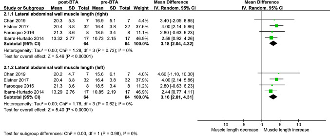 Methods: PubMed, EMBASE, CENTRAL, and CINAHL were searched for studies that investigate the injection of BTA in the lateral abdominal wall muscles. Study characteristics, BTA treatment regimens, surgical procedures, and clinical outcomes are presented descriptively. The effect of BTA on muscle- and hernia dimensions is analyzed using random-effects meta-analyses, and exclusively for studies that investigate ventral incisional hernia patients.