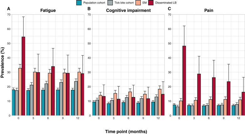 Findings: Of 1135 LB patients (94•8% erythema migrans, 5•2% disseminated LB), 1084 fulfilled primary analysis criteria, as well as 1942 population and 1887 tick-bite controls. Overall prevalence of persistent symptoms in LB patients was 27•2% (95%CI, 24•7%-29•7%); 6•0% and 3•9% higher than in population (21•2%, 95%CI, 19•3%-23•1%; p < 0•0001) and tick-bite (23•3%, 95%CI 21•3%-25•3%; p = 0•016) cohorts, respectively. At 12 months, fatigue, cognitive impairment, and pain were significantly more severe in erythema migrans patients than in reference cohorts, while in disseminated LB patients, only pain was more severe.