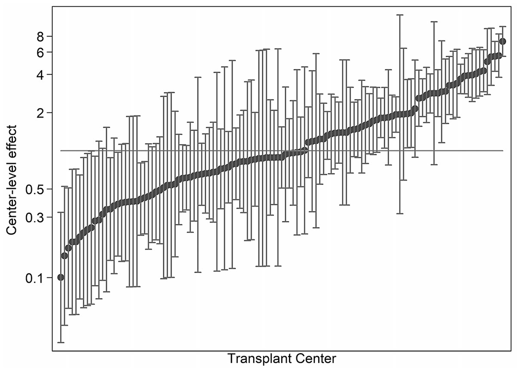 Despite a documented survival benefit, older liver donor (OLD, age ≥70) graft offers are frequently declined, with utilization worsening over the last decade. To understand how offer acceptance varies by center, we studied 1113 eventually transplanted OLD grafts from 2009 to 2017 using Scientific Registry of Transplant Recipients (SRTR) data and random-intercept multilevel logistic regression. To understand how center-level acceptance of OLD graft offers might be associated with waitlist and posttransplant outcomes, we studied all adult, actively listed, liver-only candidates and recipients during the study period using Poisson regression (transplant rate), competing risks regression (waitlist mortality), and Cox regression (posttransplant mortality). Among 117 centers, OLD offer acceptance ranged from 0 (23 centers) to 95 acceptances, with a median odds ratio of 2.88. Thus, a candidate may be three times as likely to receive an OLD graft simply by listing at a different center. Centers in the highest quartile (Q4) of OLD acceptance (accepted 39% of OLD offers) accepted more nationally shared organs (Q4 versus Q1: 14.1% versus 0.0%, P < 0.001) and had higher annual liver transplant volume (Q4 versus Q1: 80 versus 21, P < 0.001). After adjustment, nationally shared OLD offers (adjusted odds ratio [aOR]: 0.16, 95% confidence interval [CI]: 0.13-0.20) and offers to centers with higher median Model for End-Stage Liver Disease (MELD) at transplant (aOR: 0.74, 95% CI: 0.62-0.87) were less likely to be accepted. OLD offers to centers with higher annual transplant volume were more likely to be accepted (aOR: 1.21, 95% CI: 1.14-1.30). Additionally, candidates listed at centers within the highest quartile of OLD graft offer acceptance had higher deceased donor liver transplantation (DDLT) rates (adjusted incidence rate ratio: 1.45, 95% CI: 1.41-1.50), lower waitlist mortality (adjusted subhazard ratio: 0.76, 95% CI: 0.72-0.76), and similar posttransplant survival (adjusted hazard ratio: 0.93, 95% CI: 0.86-1.01) when compared with those listed at centers in the lowest quartile of OLD graft offer acceptance. The wide variation in OLD offer acceptance supports the need for optimizing the organ offer process and efficiently directing OLD offers to centers more likely to use them.