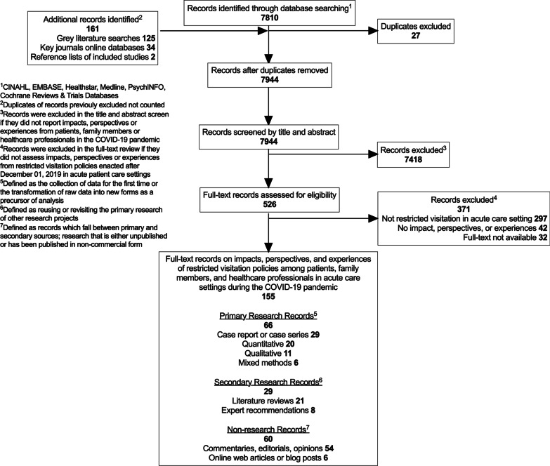 Results: Of 7810 citations, we included 155 records. Sixty-six records (43%) were primary research; 29 (44%) case reports or case series, and 26 (39%) cohort studies; 21 (14%) were literature reviews and 8 (5%) were expert recommendations; 54 (35%) were commentary, editorial, or opinion pieces. Restricted visitation policies impacted coping and daily function (n = 31, 20%) and mental health outcomes (n = 29, 19%) of patients, families, and healthcare professionals. Participants described a need for coping and support (n = 107, 69%), connection and communication (n = 107, 69%), and awareness of state of well-being (n = 101, 65%). Eighty-seven approaches to mitigate impact of restricted visitation were identified, targeting families (n = 61, 70%), patients (n = 51, 59%), and healthcare professionals (n = 40, 46%).