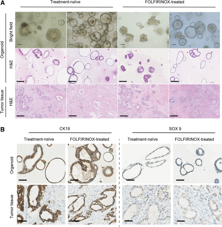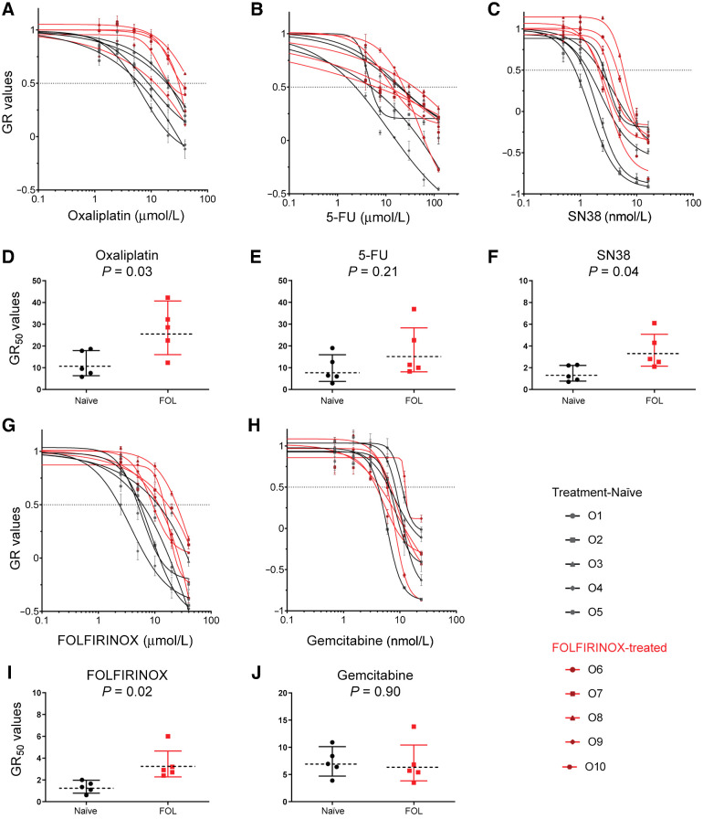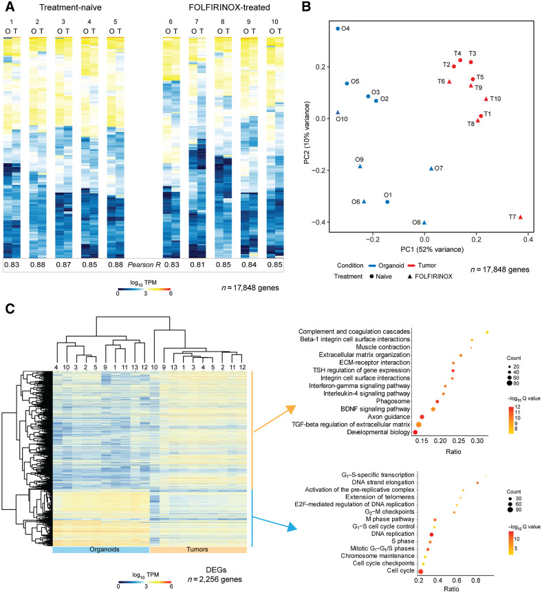Experimental design: We generated a library of 10 pancreatic ductal adenocarcinoma (PDAC) organoid lines: five each from treatment-naïve and FOLFIRINOX-treated patients. We first assessed the histologic, genetic, and transcriptional characteristics of the organoids and their matched primary PDAC tissue. Next, the organoids' response to treatment with single agents-5-FU, irinotecan, and oxaliplatin-of the FOLFIRINOX regimen as well as combined regimen was evaluated. Finally, global mRNA-seq analyses were performed to identify FOLFIRINOX resistance pathways.