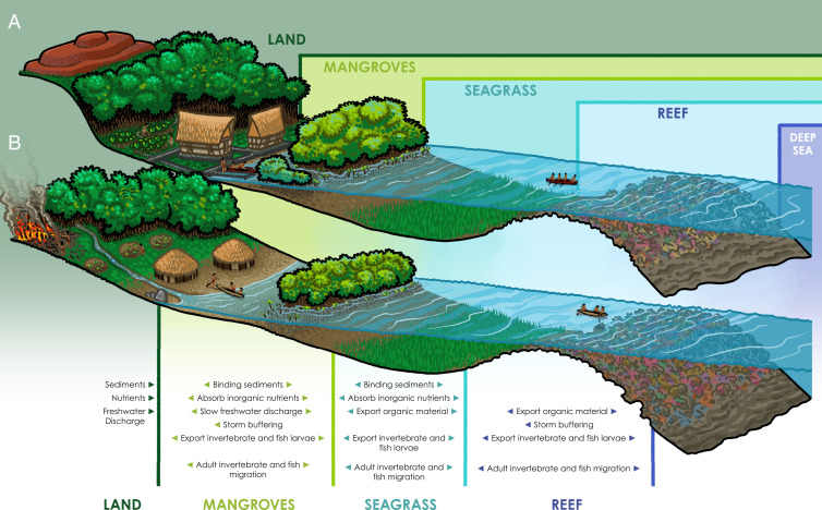 Islands are useful model systems for examining human-environmental interactions. While many anthropogenic effects visible in the archaeological and paleoecological records are terrestrial in nature (e.g., clearance of tropical forests for agriculture and settlement; introduction of nonnative flora and fauna), native peoples also relied heavily on marine environments for their subsistence and livelihood. Here we use two island case studies-Palau (Micronesia) and the Lesser Antilles (Caribbean)-and approach their long-term settlement history through a "ridge-to-reef" perspective to assess the role that human activity played in land- and seascape change over deep time. In particular, we examine the entanglement of terrestrial and marine ecosystems resulting from anthropogenic effects and cultural responses to socio-environmental feedback. We suggest that on the humanized tropical islands of the Anthropocene, mangroves, near shore and littoral areas, and coral reefs were major sites of terrestrial-marine interface chronicling and modulating anthropogenic effects.