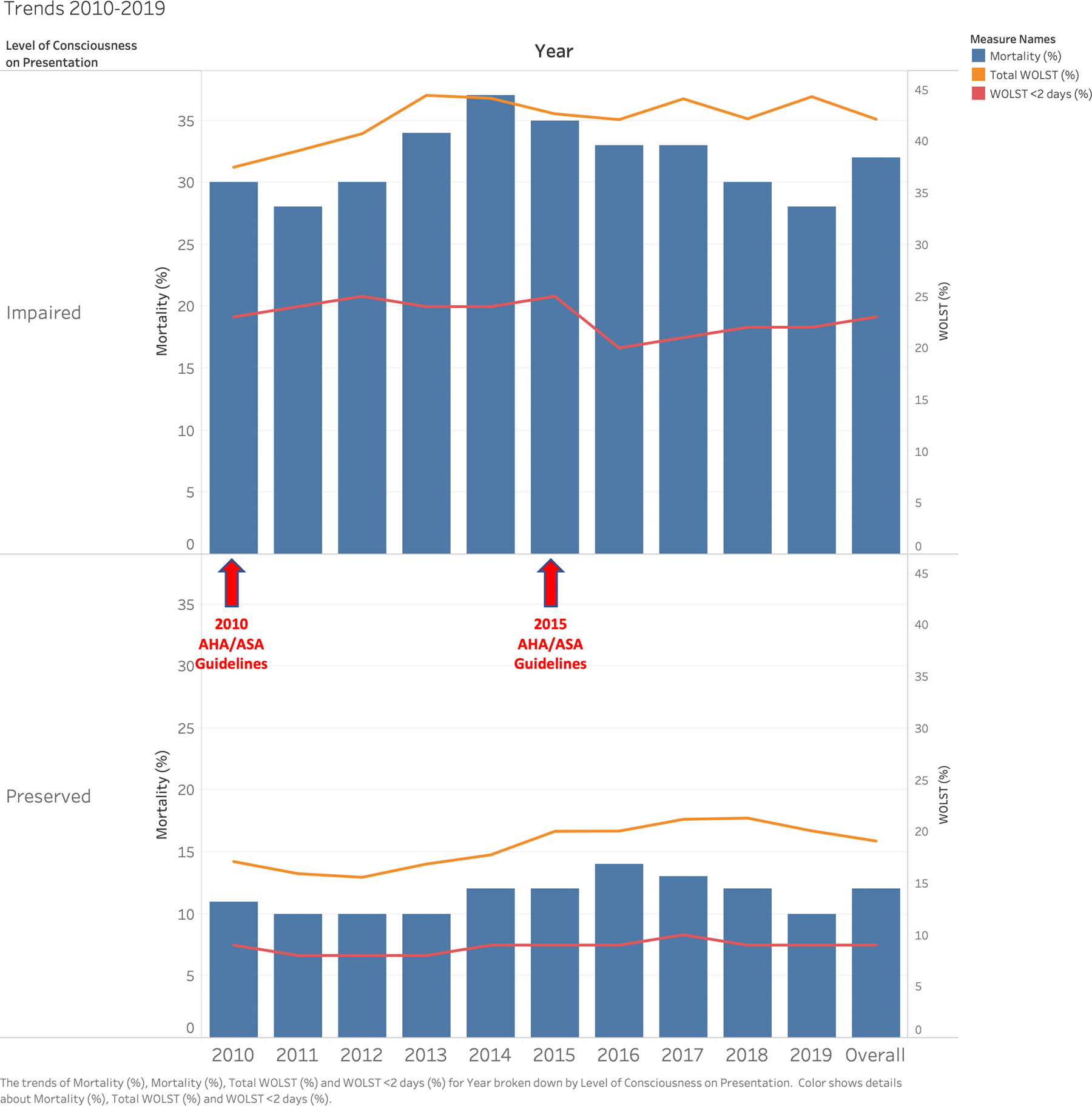 Conclusions: In this large multicenter stroke registry, a third of ICH cases presented with impaired LOC. Impaired LOC was associated with greater in-hospital mortality and worse disposition at discharge, largely influenced by early decision to withhold or WOLST.