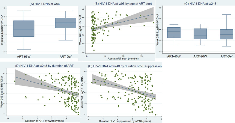 Findings: Longer duration of ART was significantly associated with lower HIV-1 proviral DNA at both 96 (p = 0.0003) and 248 weeks (p = 0.0011). Higher total CD8 count at ART initiation was associated with lower HIV-1 proviral DNA at both 96 (p = 0.0225) and 248 weeks (p = 0.0398). Week 248 HIV-1 proviral DNA was significantly higher in those with positive HIV-1 serology at week 84 than those with negative serology (p = 0.0042).