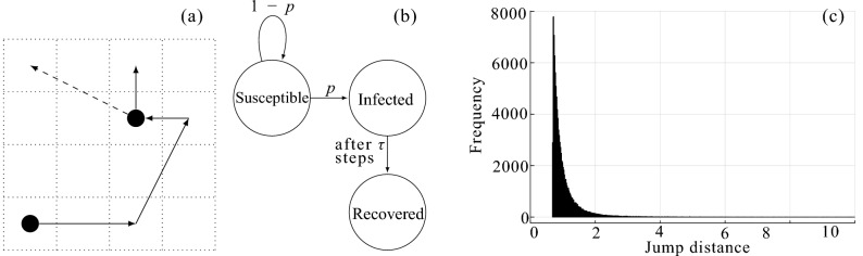 Random walkers on a two-dimensional square lattice are used to explore the spatio-temporal growth of an epidemic. We have found that a simple random-walk system generates non-trivial dynamics compared with traditional well-mixed models. Phase diagrams characterizing the long-term behaviors of the epidemics are calculated numerically. The functional dependence of the basic reproductive number [Formula: see text] on the model's defining parameters reveals the role of spatial fluctuations and leads to a novel expression for [Formula: see text]. Special attention is given to simulations of inter-regional transmission of the contagion. The scaling of the epidemic with respect to space and time scales is studied in detail in the critical region, which is shown to be compatible with the directed-percolation universality class.