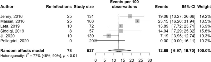 Methods: Between April 2015 and December 2020, Medline, Embase, and The Cochrane Library were searched for studies reporting reinfection outcomes in patients treated with one-stage and two-stage knee or hip revision arthroplasty. Two reviewers independently extracted data and disagreements were resolved by a third investigator. We utilized a double arcsine transformation, prior to pooling using a random-effects model.