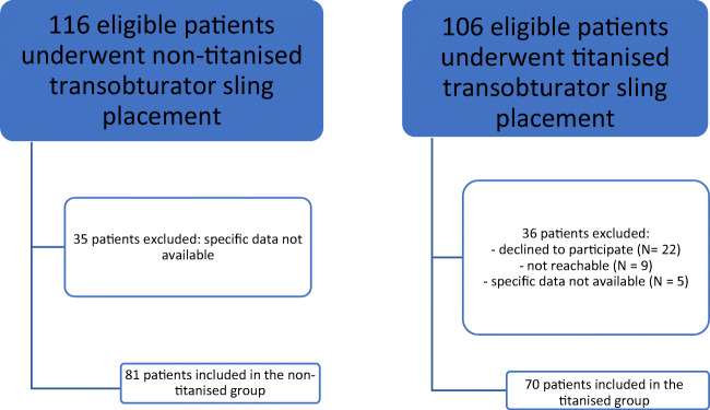 Methods: A prospective study was conducted with 151 patients. Seventy patients underwent transobturator sling surgery with titanium tape from 2011 to 2019, and a historical control group (CG) of 81 patients was treated with a noncoated tape and underwent incontinence surgery from 1999 to 2009. We compared patient-reported outcome measures (PROMs) with the incontinence outcome questionnaire (IOQ).