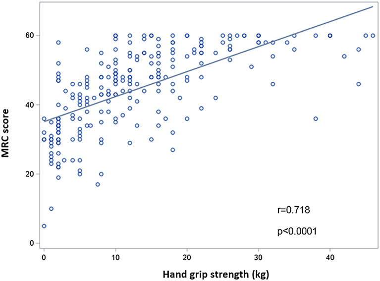 Results: 233 patients were included. Extubation failure occurred in 51 (22.5%) patients, 39 (17.2%) required reintubation. Handgrip strength was 12 [6-20] kg and 12 [8-20] kg, respectively, in extubation success and failure (p = 0.85). There was no association between extubation outcome and MRC score, MIP or PCEF. Handgrip strength was well correlated with MRC score (r = 0.718, p < 0.0001). ICU and hospital length of stay were significantly higher in the subset of patients harboring muscular weakness as defined by handgrip performed at the first weaning trial (respectively, 15 [10-25] days vs. 11 [7-17] days, p = 0.001 and 34 [19-66] days vs. 22 [15-43] days, p = 0.002).