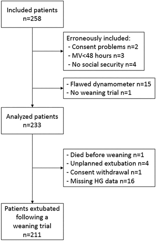 Methods: Prospective multicenter trial over an 18 months period in six mixed ICUs. Adults receiving mechanical ventilation for at least 48 h were eligible. Just before weaning trial, HG, Maximal Inspiratory Pressure (MIP), Peak Cough Expiratory Flow (PCEF) and Medical Research Council (MRC) score were registered. The attending physicians were unaware of the tests results and weaning procedures were conducted according to guidelines. Occurrence of unscheduled reintubation, non-invasive ventilation (NIV) or high-flow nasal continuous oxygen (HFNC) because of respiratory failure within 7 days after extubation defined extubation failure. The main outcome was the link between HG and extubation outcome.
