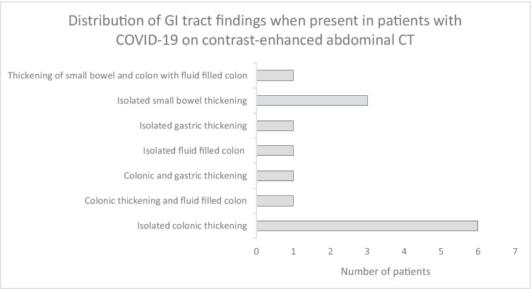 Conclusion: Aside from lung base ground glass opacities, the most common new imaging abnormality on abdominopelvic CT in patients with COVID-19 finding in our cohort was abnormalities of the gastrointestinal tract, followed by small volume ascites, gallbladder distention, and isolated cases of pancreatitis and portal vein thrombosis. These findings overlap with those previously reported that did not have a prior scan for comparison, and provide supportive evidence that some of these findings may be related to SARS-CoV-2 infection.