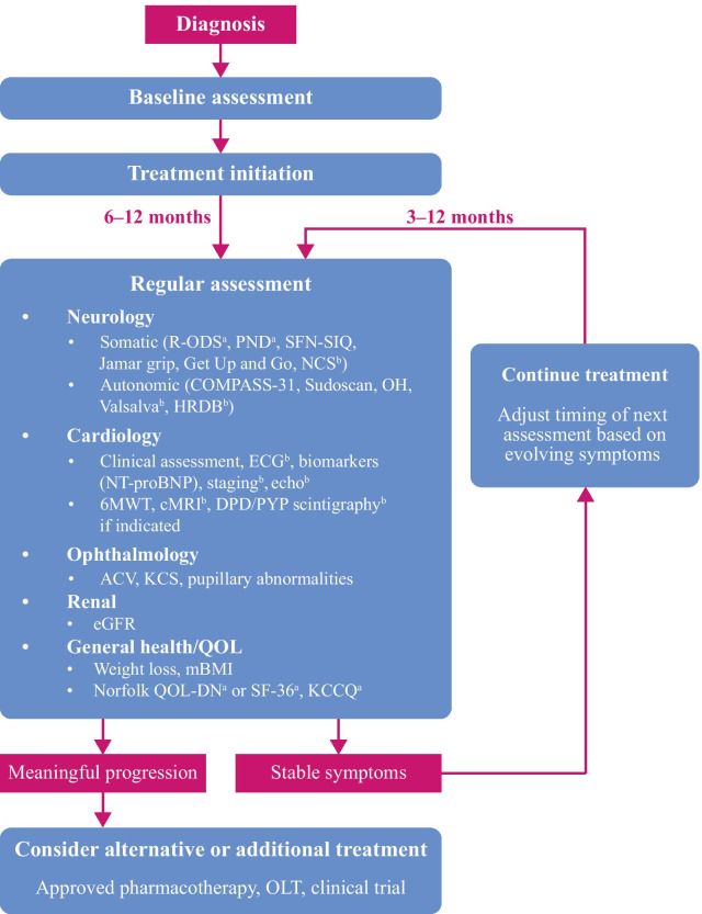 Monitoring disease and progression: A multidisciplinary team should monitor ATTRv amyloidosis disease course by assessing potential target organs at baseline and during follow-up for signs and symptoms of somatic and autonomic neuropathy, cardiac dysfunction and restrictive cardiomyopathy, and other manifestations. Variability in penetrance, symptoms, and course of ATTRv amyloidosis requires that all patients, regardless of variant status, undergo regular and standardized assessment in all these categories. Progression in ATTRv amyloidosis may be indicated by: worsening of several existing quantifiable symptoms or signs; the appearance of a new symptom; or the worsening of a single symptom that results in a meaningful functional impairment.