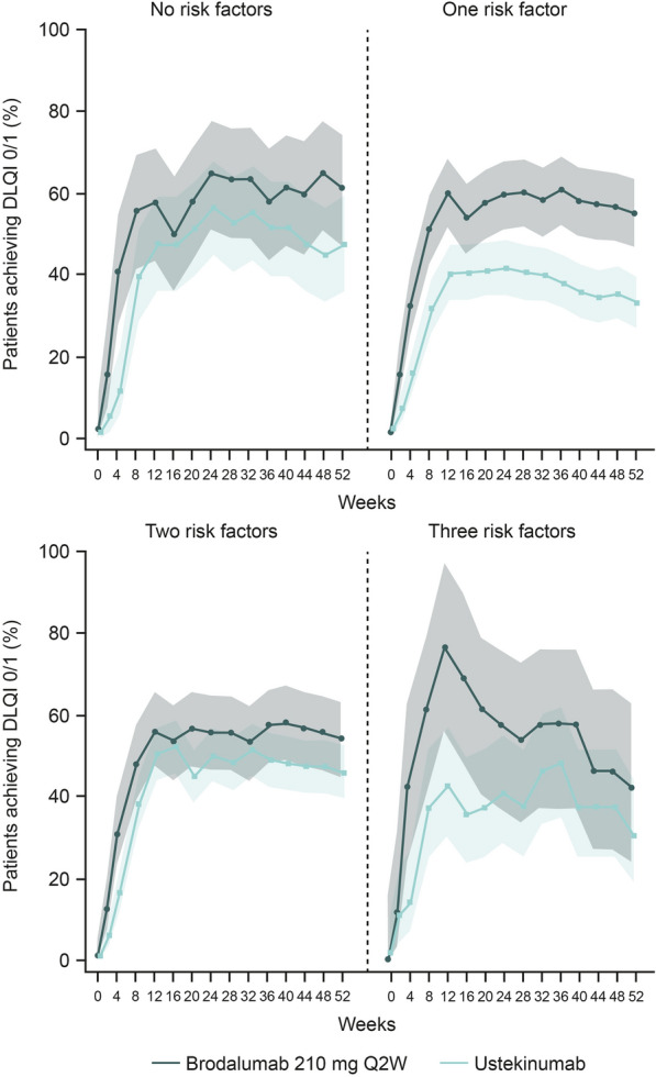 Results: This analysis included 929 patients (brodalumab 210 mg, n = 339; ustekinumab, n = 590) with moderate-to-severe psoriasis. At week 52, odds ratios (95% confidence intervals [CIs]) for complete clearance with brodalumab versus ustekinumab were 2.50 (1.14-5.46, P = 0.0186), 4.64 (2.80-7.69, P < 0.0001), 2.06 (1.25-3.40, P = 0.0045), and 2.55 (0.55-11.91, P = 0.2117) in patients with no, one, two, or three risk factors, respectively. Corresponding odds ratios (ORs) (95% CIs) for DLQI 0/1 with brodalumab versus ustekinumab were 1.72 (0.78-3.79, P = 0.1883), 2.49 (1.54-4.02, P < 0.0002), 1.57 (0.97-2.54, P = 0.0666), and 2.07 (0.45-9.57, P = 0.3438). The 52-week cumulative incidence of patients achieving PASI100 was consistently higher for brodalumab versus ustekinumab, regardless of number of risk factors (P < 0.0001 for one or two risk factors and P = 0.0029 for three risk factors).