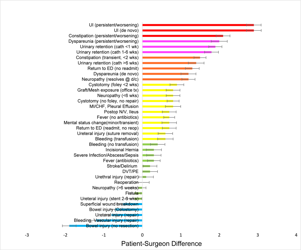 Results: Patients rated bother higher than severity for 36 of 38 complications (all differences ≤0.5 points). For statistical analysis, the highest response to patient bother/severity was chosen to weigh in favor of the patient. Patient bother/severity scores were significantly different (±0.5 points) for 27 of 38 complications compared with surgeon responses. Surgeon scores were higher for 5 complications (0.5-1.9 point differences) related to major injury requiring repair and wound breakdown. Patient scores were higher for 22 complications with the highest differences related to dyspareunia, constipation, or new/persistent urinary incontinence.