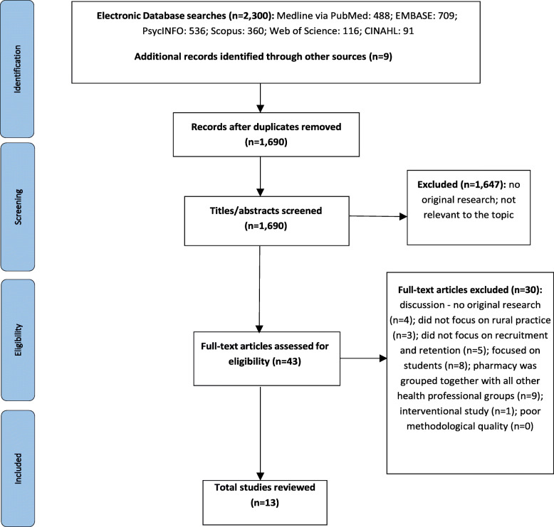 Results: The final review included 13 studies, with quantitative, qualitative, or mixed methods research design. Study-specific factors associated with recruitment and retention of pharmacists in rural practice were identified and grouped into five main themes: geographic and family-related, economic and resources, scope of practice or skills development, the practice environment, and community and practice support factors.
