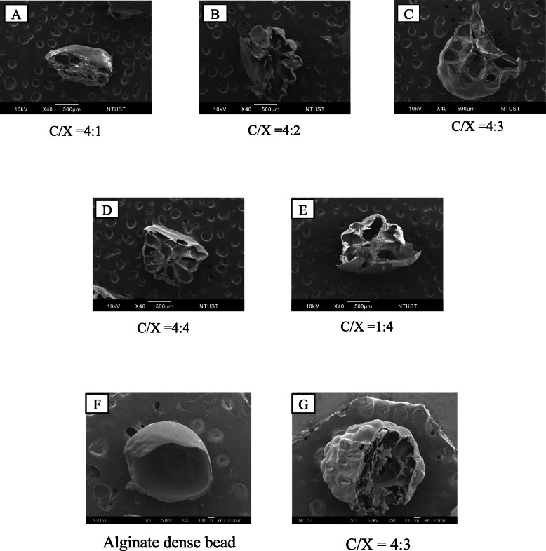 Methods: In this research, we prepared the floating core-shell beads carrying tetracycline. The ratio of chitosan and xanthan gum in the shell layer was changed to modify polymer compactness. Tetracycline was encapsulated in the alginate core.