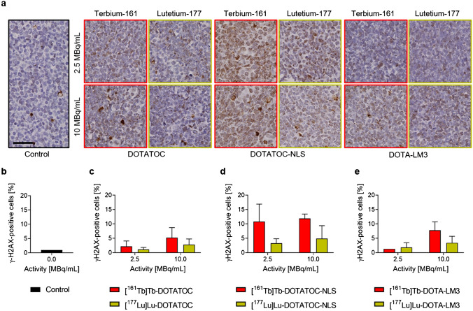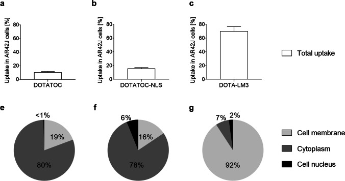 Purpose: The β¯-emitting terbium-161 also emits conversion and Auger electrons, which are believed to be effective in killing single cancer cells. Terbium-161 was applied with somatostatin receptor (SSTR) agonists that localize in the cytoplasm (DOTATOC) and cellular nucleus (DOTATOC-NLS) or with a SSTR antagonist that localizes at the cell membrane (DOTA-LM3). The aim was to identify the most favorable peptide/terbium-161 combination for the treatment of neuroendocrine neoplasms (NENs).