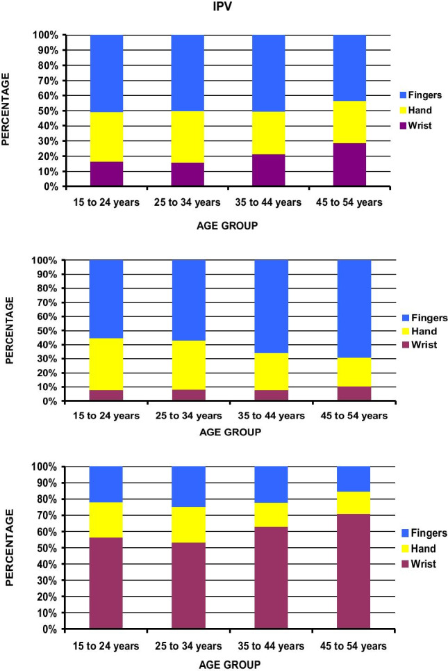 Results: IPV-related UEF represented 1.7% of all UEF and 27.2% of all IPV fractures. The finger was the most common fracture site in IPV (34.3%) and accidental striking (53.3%) but accounted for only 10% of fall-related UEF. There was a higher proportion of shoulder fractures in IPV (9.2%) compared to accidental falls (7.4%) or strikes (2.9%). The odds of a finger fracture were 4.32 times greater in IPV than falling and of a shoulder fracture were 3.65 greater in IPV than accidental striking (p < 0.0001).