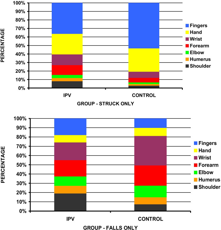 Conclusions: While the finger is the most common site for IPV UEF, it is also the most common location for accidental striking. A lower proportion of finger fractures in fall and of shoulder/forearm fractures in accidental striking should prompt the radiologist to discuss the possibility of IPV with the ED physician in any woman presenting with a finger fracture due to fall and a shoulder/forearm fracture with a vague history of accidental striking.