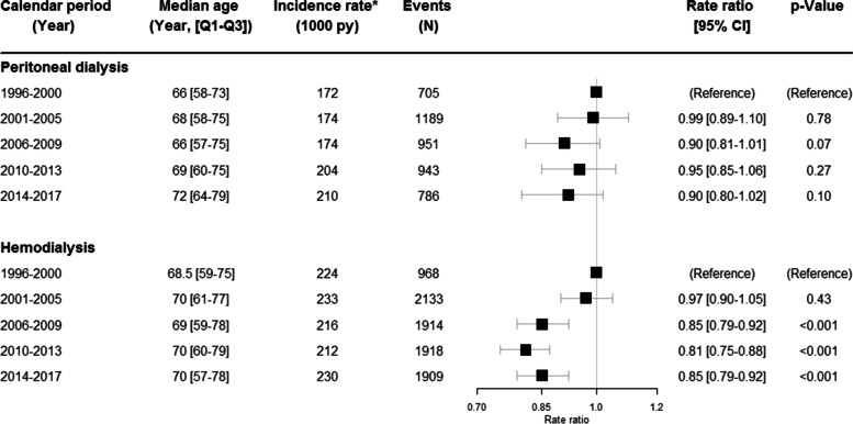Results: In 4285 patients with PD (63.7% males) the median age increased across the calendar periods from 65 [57-73] in 1996-2000 to 69 [55-76] in 2014-2017, (p < 0.0001). In 9952 patients with HD (69.2% males), the overall median age was 71 [61-78] without any changes over time. Among PD, an overall non-significant decreasing trend in rate ratios (RR) of CVD was found, (p = 0,071). RR of pneumonia increased significantly throughout the calendar with an almost two-fold increase of the RR in 2014-2017 (RR 1.71; 95% CI 1.46-2.0), (p < 0.001), as compared to the reference period. The RR of IE decreased significantly until 2009 (RR 0.43; 95% CI 0.21-0.87), followed by a return to the reference level in 2010-2013 (RR 0.87; 95% CI 0.47-1.60 and 2014-2017 (RR 1.1; 95% CI 0.59-2.04). A highly significant (p < 0.001) increase in sepsis was revealed across the calendar periods with an almost 5-fold increase in 2014-2017 (RR 4.69 95% CI 3.69-5.96). In HD, the RR of CVD decreased significantly (p < 0.001) from 2006 to 2017 (RR 0.85; 95% CI 0.79-0.92). Compared to the reference period, the RR for pneumonia was high during all calendar periods (p < 0.05). The RR of IE was initially unchanged (p = 0.4) but increased in 2010-2013 (RR 2.02; 95% CI 1.43-2.85) and 2014-2017 (RR 3.39; 95% CI 2.42-4.75). No significant changes in sepsis were seen.