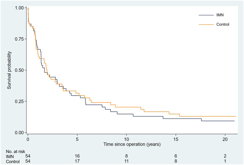 Methods: This study included patients undergoing surgery for cancers of the pancreas, oesophagus and stomach, who had been randomised in a double-blind manner to receive postoperative jejunostomy feeding with IMN (Stresson, Nutricia Ltd.) or an isonitrogenous, isocaloric feed (Nutrison High Protein, Nutricia) for 10-15 days. The primary outcome was long-term overall survival.