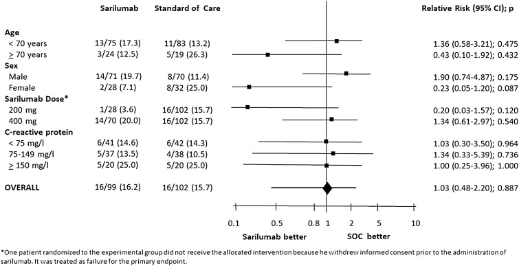 Results: A total of 201 patients underwent randomization: 99 patients in the sarilumab group and 102 patients in the control group. The rate of patients progressing to severe respiratory failure (Brescia-COVID scale score ≥ 3) up to day 15 was 16.16% in the Sarilumab group versus 15.69% in the control group (RR 1.03; 95% CI 0.48-2.20). No relevant safety issues were identified.