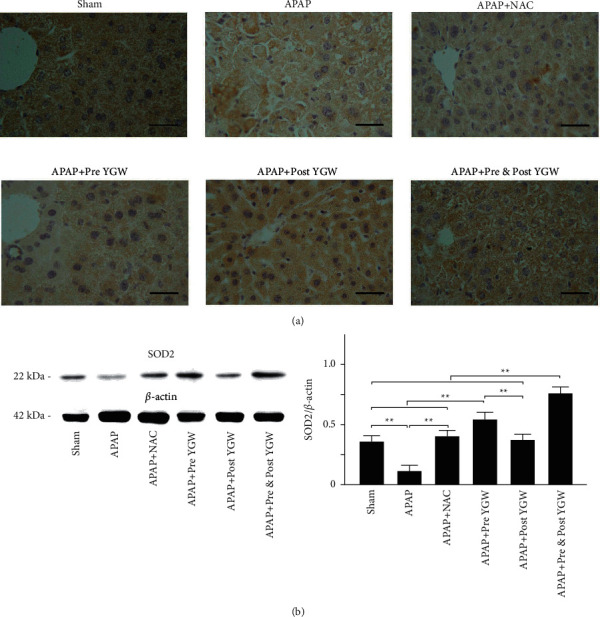A hepatoprotective medicine, Yang-Gan-Wan (YGW), was used to treat hepatic damage in cell and mouse models. We performed a 1,1-diphenyl-2- picrylhydrazyl (DPPH) assay and found that YGW exhibited a significantly high free radical scavenging ability. Furthermore, the results of the 3-(4,5-dimethylthiazol-2-yl)-2,5-diphenyltetrazolium bromide (MTT) assay revealed that YGW treatment could alleviate lipopolysaccharide (LPS)-induced damage in Kupffer cells (liver macrophages). Enzyme-linked immunosorbent assay results demonstrated that YGW treatment could alleviate LPS-induced inflammation in Kupffer cells by inhibiting the expression of tumor necrosis factor (TNF)-α and interleukin (IL)-1β. By quantifying the serum levels of alanine aminotransferase (ALT) and aspartate aminotransferase (AST), we found that YGW treatment could alleviate hepatic damage and improve immunity in acetaminophen- (APAP-) treated mice by inhibiting the expression of ALT and AST. The findings of hematoxylin and eosin and Masson's trichrome staining indicated that YGW treatment could alleviate hepatic damage and reduce collagen fiber formation in the liver tissue of APAP-treated mice. Furthermore, immunohistochemistry staining and Western blot results showed that YGW treatment could alleviate oxidative stress, inflammation, and apoptosis in the liver tissue of APAP-treated mice by enhancing superoxide dismutase 2 (SOD2) expression but inhibiting TNF-α and caspase 3 expression. Our results suggest that YGW treatment exerted hepatoprotective effects on LPS-treated Kupffer cells and APAP-treated mice by inhibiting oxidation, inflammation, and apoptosis.